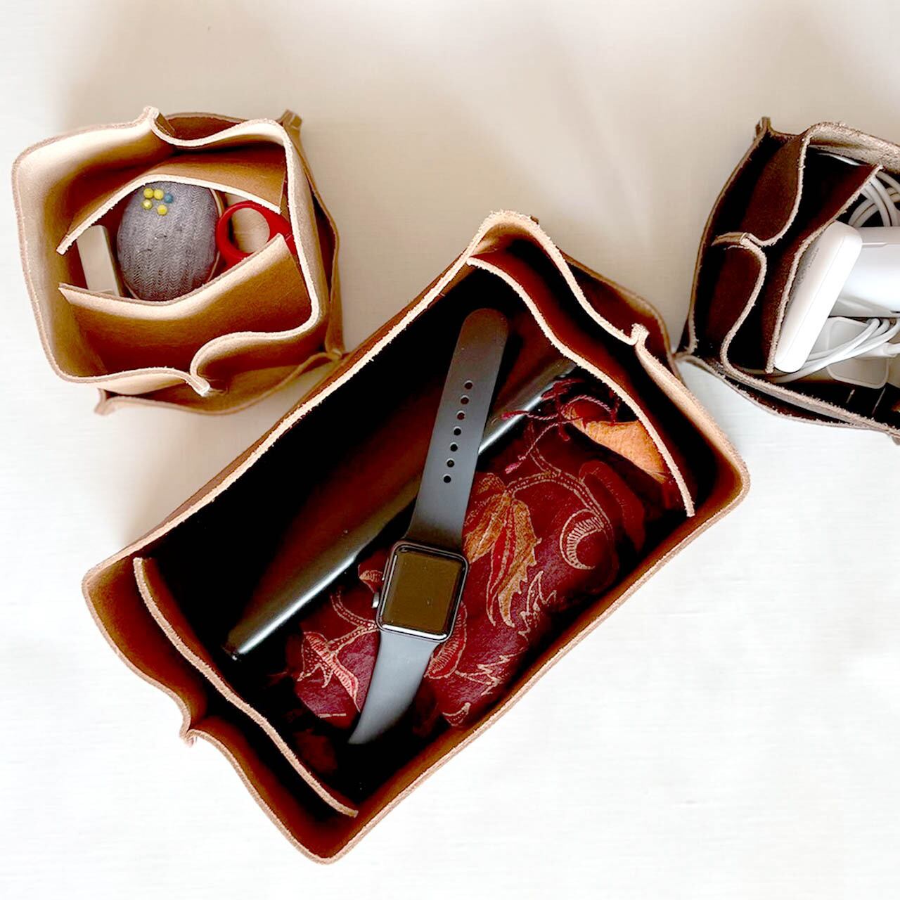 ざらざらとした手触りと素朴さが特徴の収納boxです。牛床革に防水、防腐、防虫効果があるとされる柿渋染めを施して独特な風合いを表現しました。床革とは、革の表面を取り除いた内層部分の革です。