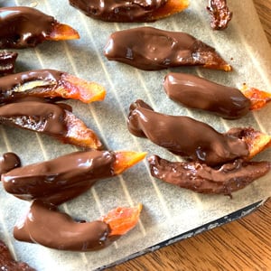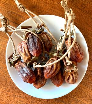 白い粉をふいた干柿。そのまま食べても美味しいですが、色々な料理にアレンジして食べるのも楽しみです。今年はチョコをコーティングしてオランジェにしてみました!
